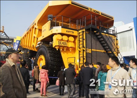 此次宝马展上,徐工成功推出DE400矿用卡车。DE400是由徐州工程机械研究院研制生产,是目前全球载重量最大的矿用卡车,载重量可达400公吨,最高速度50km/h,举升时间24s。采用先进的交流电传动系统,原装进口环保电控高性能柴油发动机,动力强劲。箱形截面结构车架,由高强度优质合金钢板和铸钢件制造。智能制动技术,防止误操作。符合人机工程学的驾驶室舒适安全。整车配备自动称重系统、集中灭火系统、快速注油系统、自动润滑系统及各种安全设备,保证整车运行安全高效。